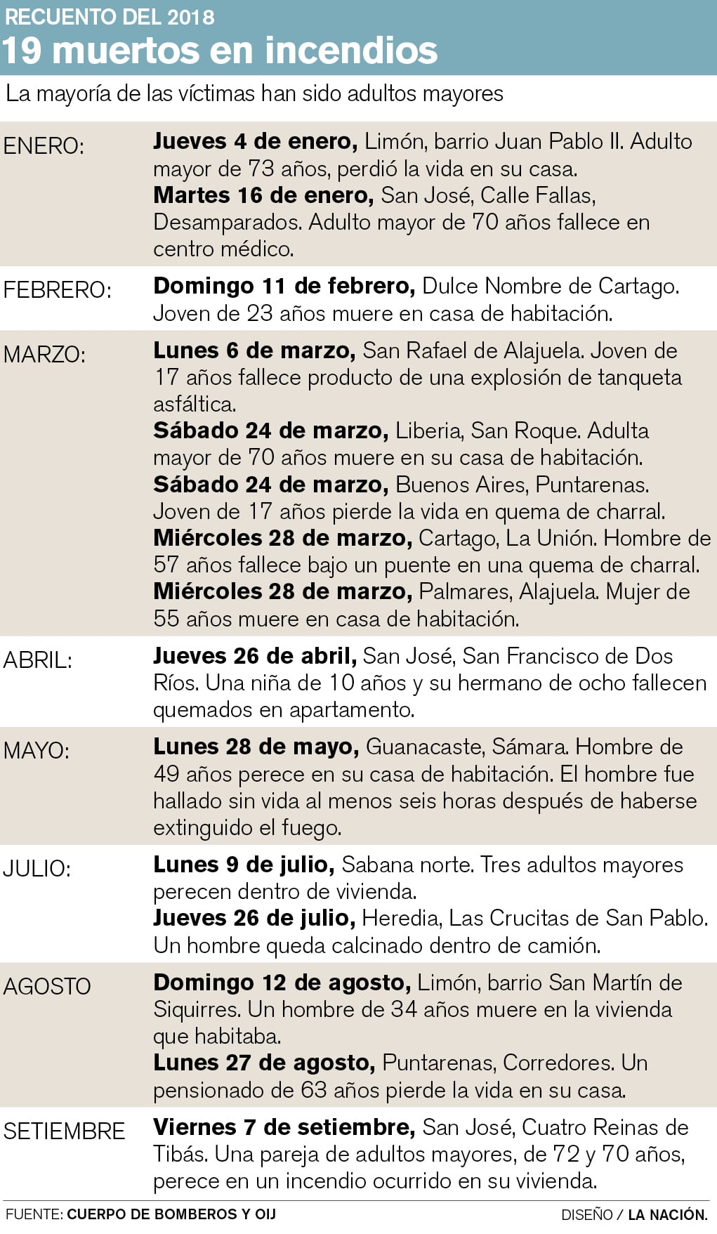 Los últimos fallecidos por fuego fueron un pensionado del Poder Judicial de apellido Ovares, de 63 años, cuyo deceso se produjo el 27 de agosto en Florida de Corredores, Puntarenas y otro hombre, de 34 años, murió el pasado 12 de agosto en el barrio San Martín de Siquirres.