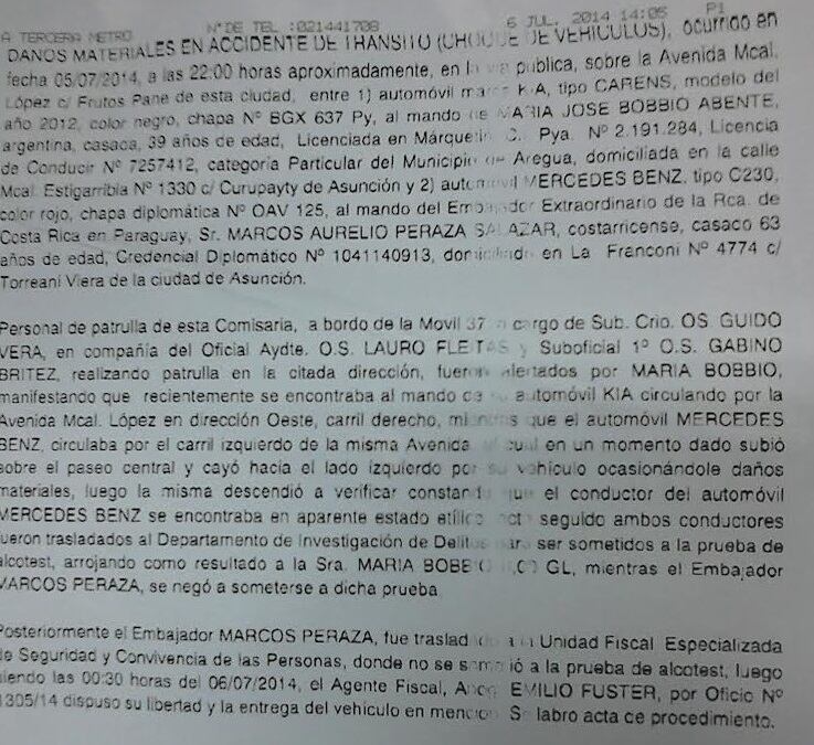Marcos Aurelio Peraza Salazar, embajador de Costa Rica en Paraguay, se negó a que se le realizara la alcoholemia luego de que vehículo diplomático que conducía chocó contra uno particular en Asunción, capital de Paraguay.