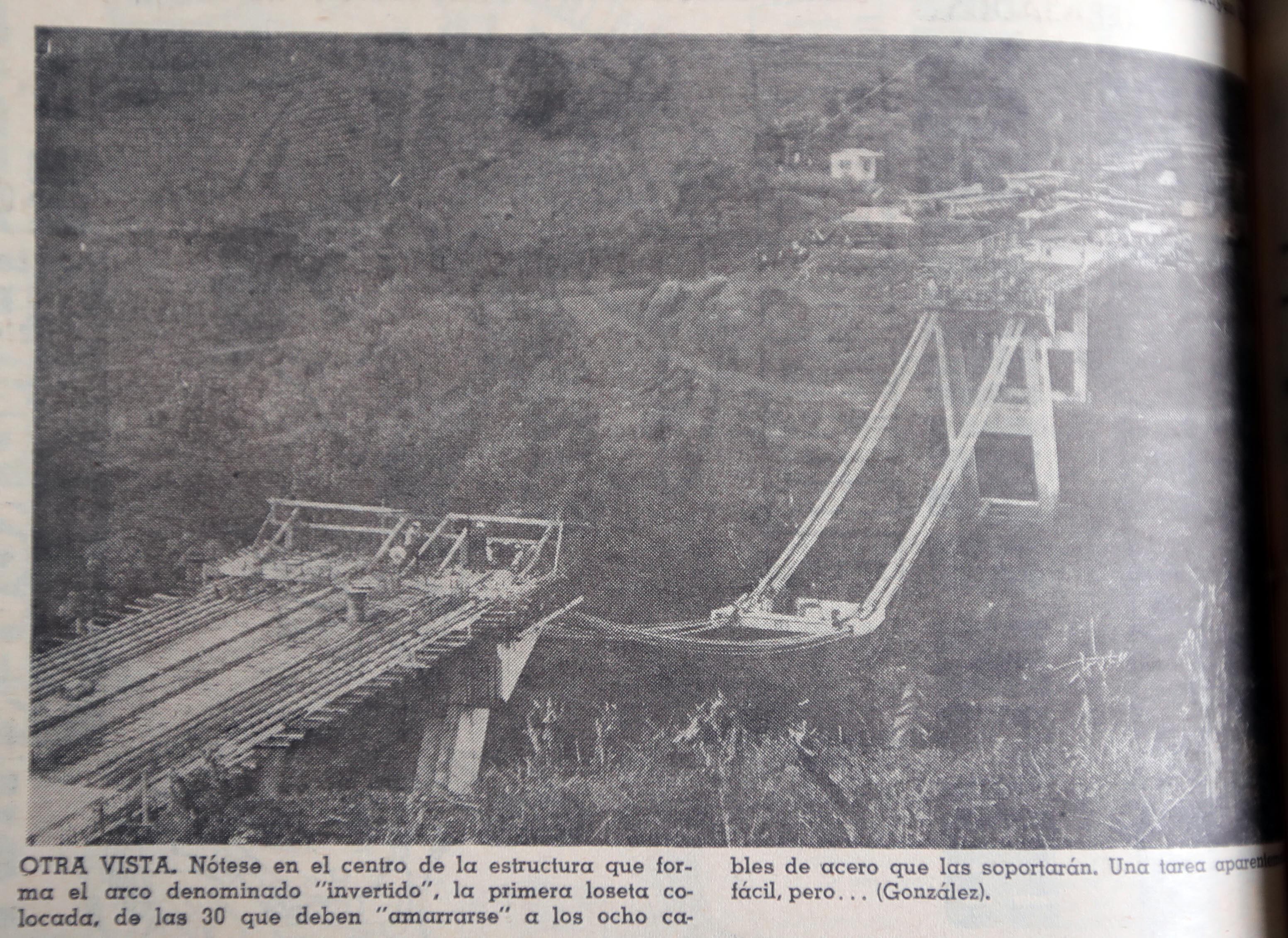 Una mole de cemento y acero se levanta sobre el río Colorado, en Grecia, como parte de la carretera Bernardo Soto. 204 metros de bastión a bastión, 119 metros de altura sobre el cauce y 6.000 toneladas de peso con un valor de ¢7.000.000. ¡El puente más largo y más alto del país! Y lo que es más: el primer puente en el mundo que primero se construye y luego se arma, como si se tratara de un gigantesco mecano de cemento, cable y acero.