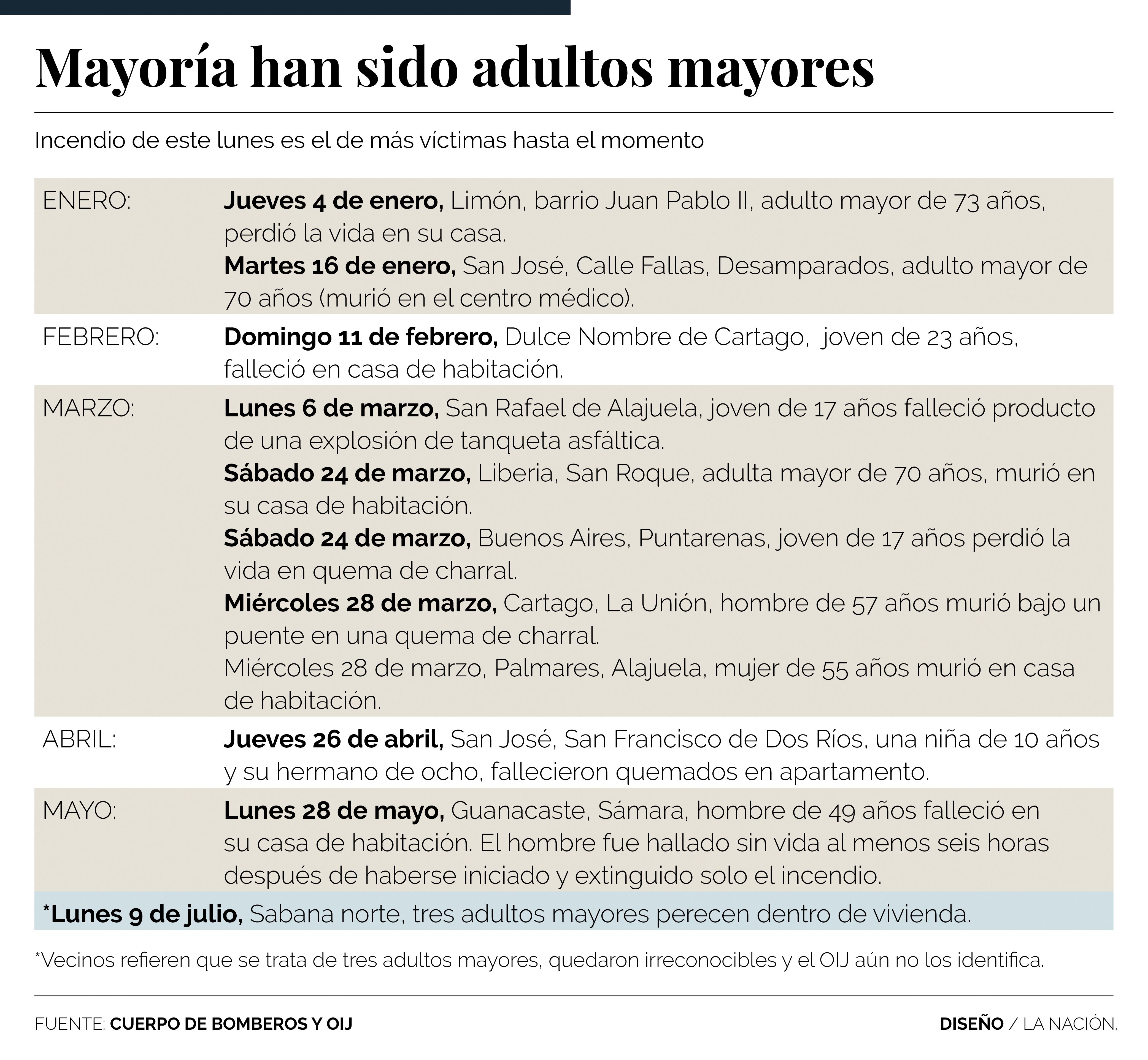 Tres adultos mayores, uno de ellos que se movilizaba con ayuda de una silla de ruedas, fallecieron la madrugada de este lunes, producto de un incendio ocurrido en el rancho donde vivían a un lado de la autopista General Cañas, en Sabana norte, San José.