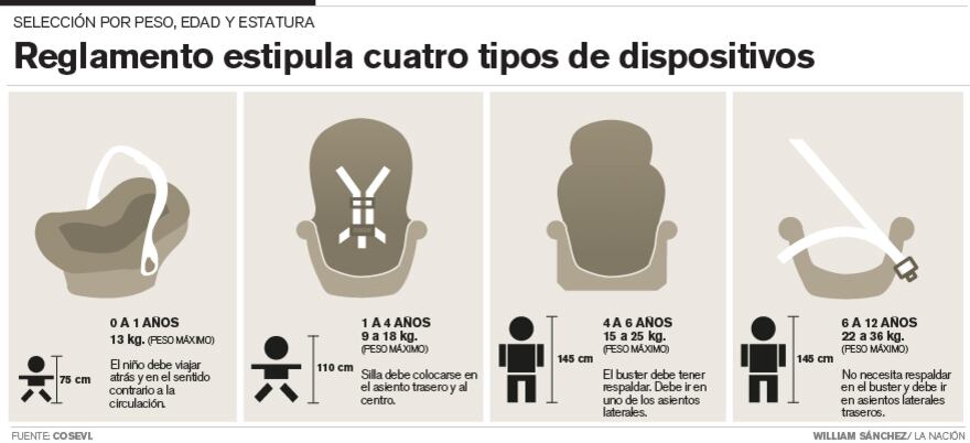 De acuerdo con la Ley de Tránsito es obligación trasladar a los niños y niñas con menos de 1,45 metros de estatura y menores de 12 años en vehículos particulares con un portabebé, silla, booster o booster con respaldar, según la edad, talla y peso del menor. De lo contrario, el conductor se expone a una multa de ¢211.041,46 y sumar cuatro puntos en la licencia.