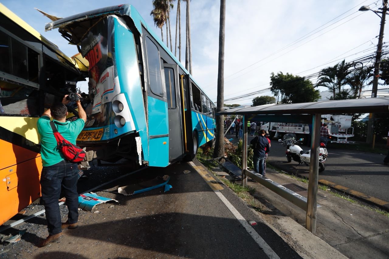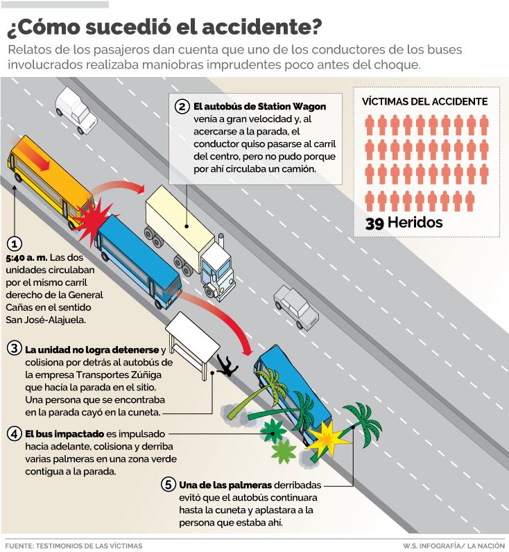 El accidente ocurrió en el sentido San José - Alajuela a las 5:40 a. m., en la parada frente a la Dirección General de Migración y Extranjería, en La Uruca, cuando un autobús de Station Wagon golpeó por detrás a otro de Transportes Zúñiga que estaba detenido.