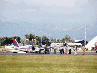 Alajuela (Redacción). Una aeronave bimotor, marca Pipper Azteca, se estrelló esta tarde contra la pista del aeropuerto Internacional Juan Santamaría.