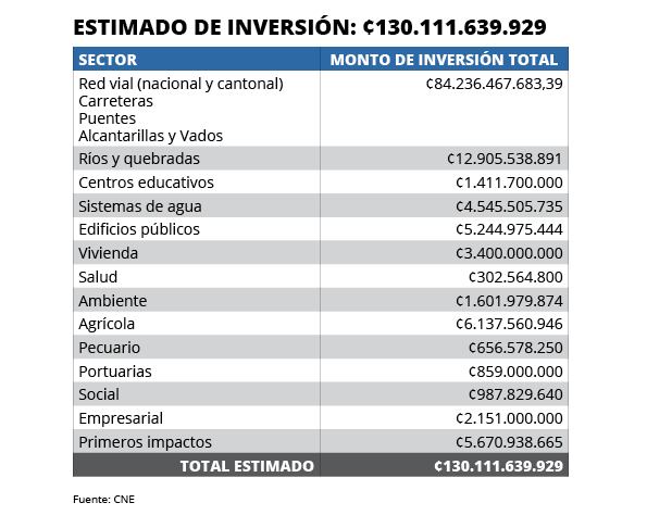 Desglose. La CNE informó de que para recuperar carreteras, puentes y alcantarillas se requieren ¢84.000 millones.