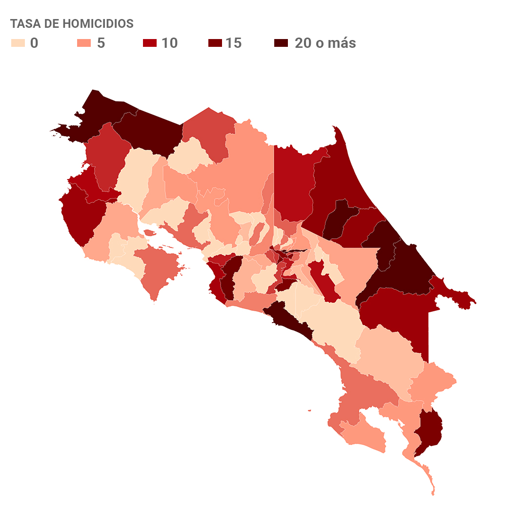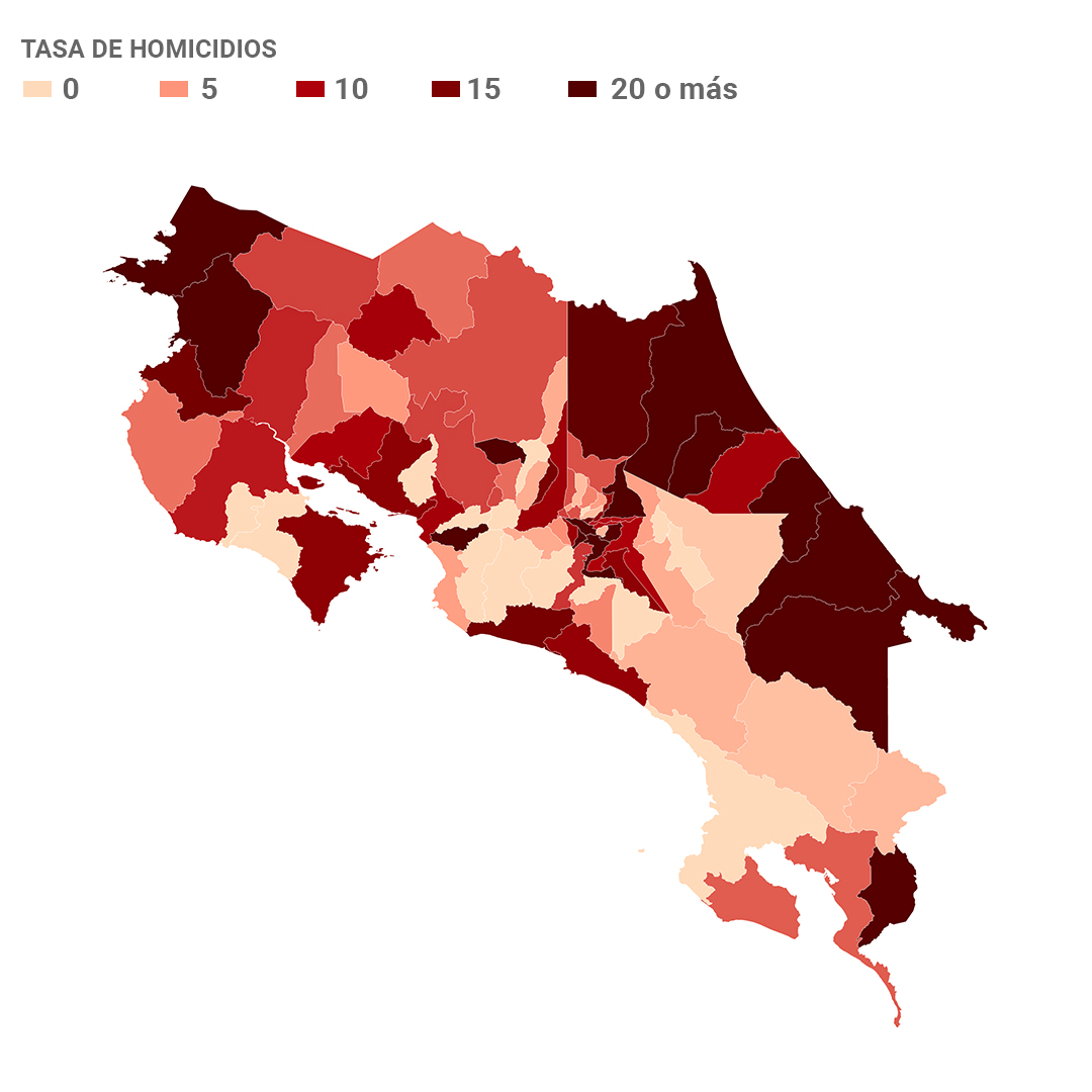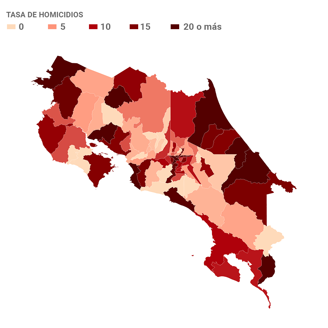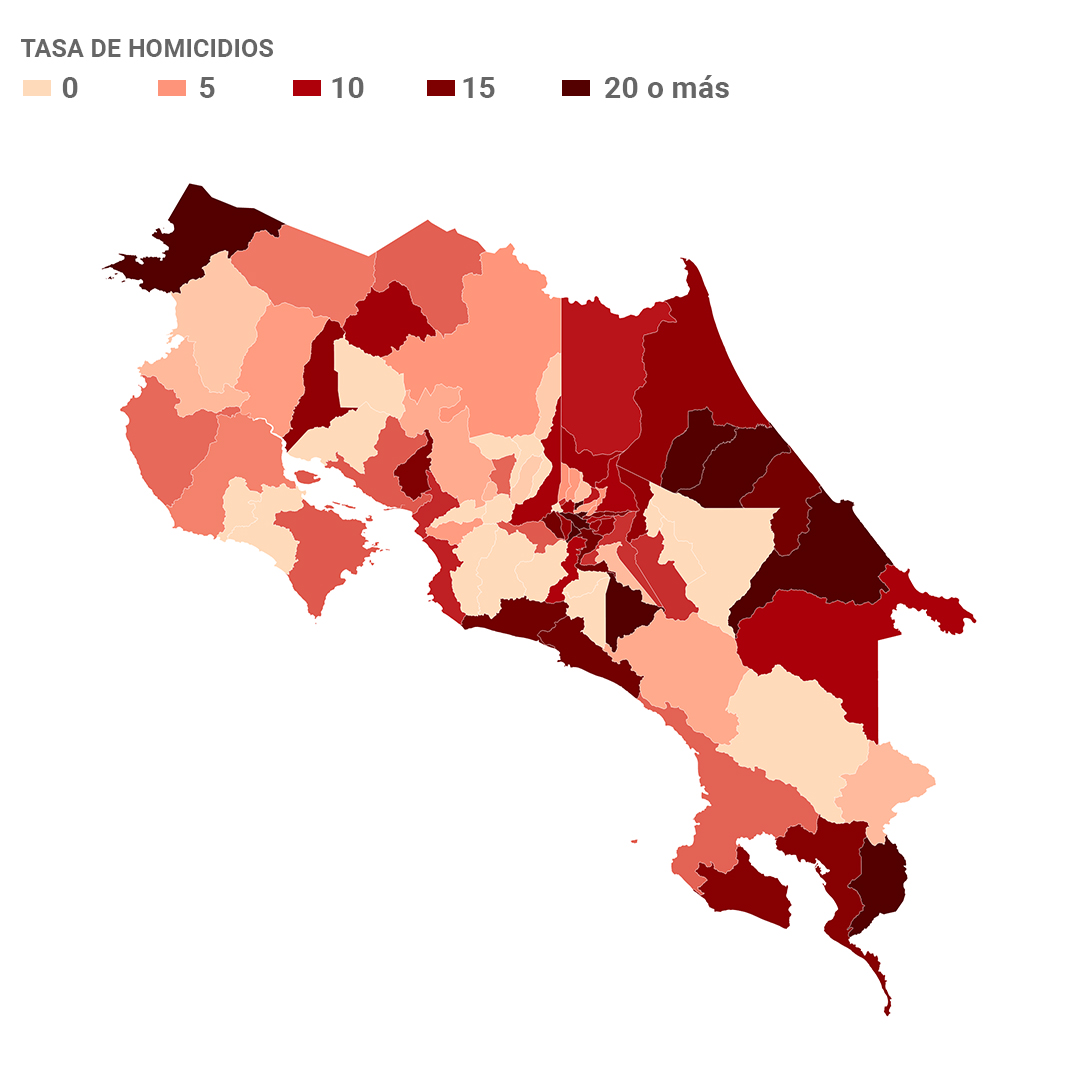 El incremento de la violencia en Cartago es aún más notorio cuando se analizan las tasas de homicidio por cantón, a nivel nacional.