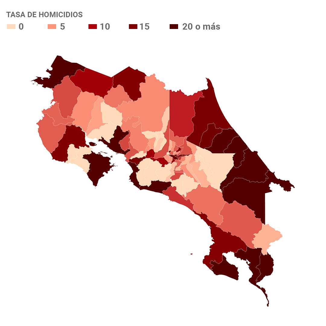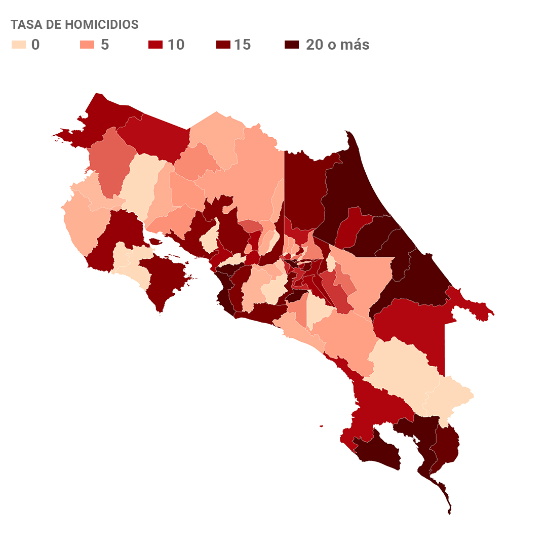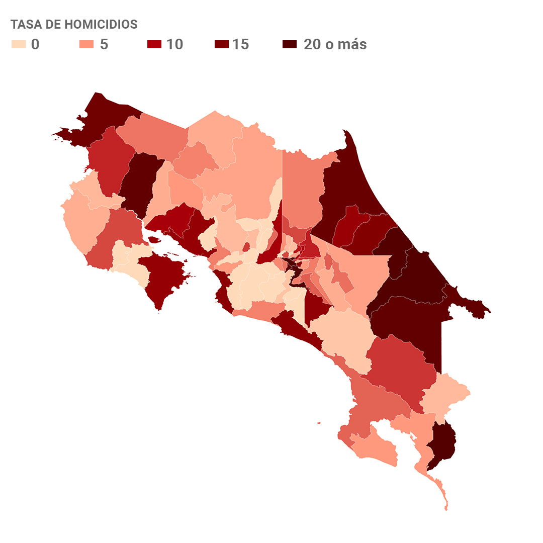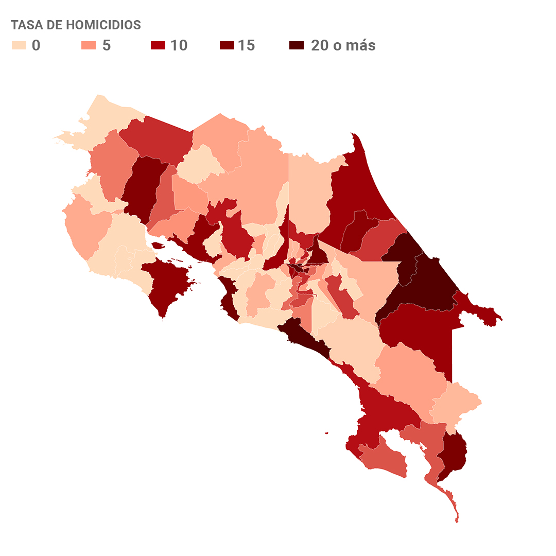 El incremento de la violencia en Cartago es aún más notorio cuando se analizan las tasas de homicidio por cantón, a nivel nacional.