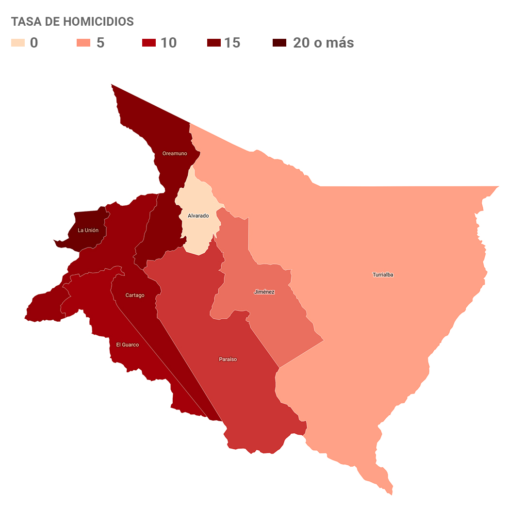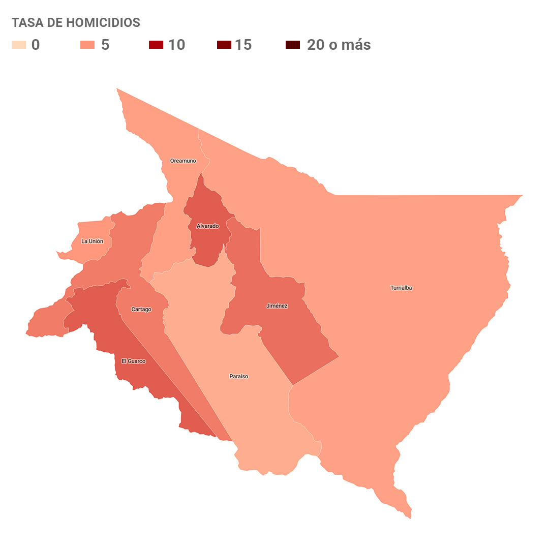 El año pasado, cuatro de los ocho cantones que componen la provincia se ubicaron entre los 30 más violentos: La Unión (puesto 12), Oreamuno (19), el cantón central (24) y El Guarco (28).