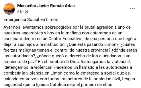 “Hacemos un llamado a las autoridades a combatir la violencia en Limón como la emergencia social que es, uniendo esfuerzos con todos los actores de la sociedad civil, tengan seguridad que la Iglesia católica será el primero de ellos”, afirmó el religioso.