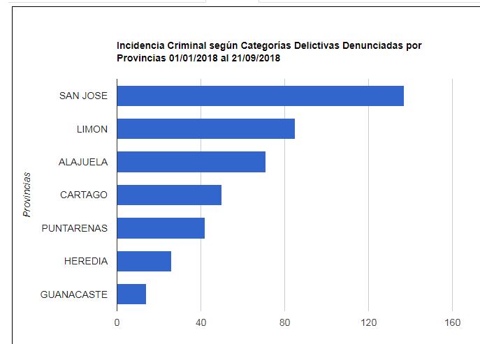 En lo que va de este año, la Policía Judicial registra 427 asesinatos, siendo San José (138) y Limón (85) las provincias con más muertes por este tipo de delito. Les sigue Alajuela con 72 casos, mientras que en igual periodo del 2016 Alajuela contabilizaba 64, según el Departamento de Estadísticas del OIJ.