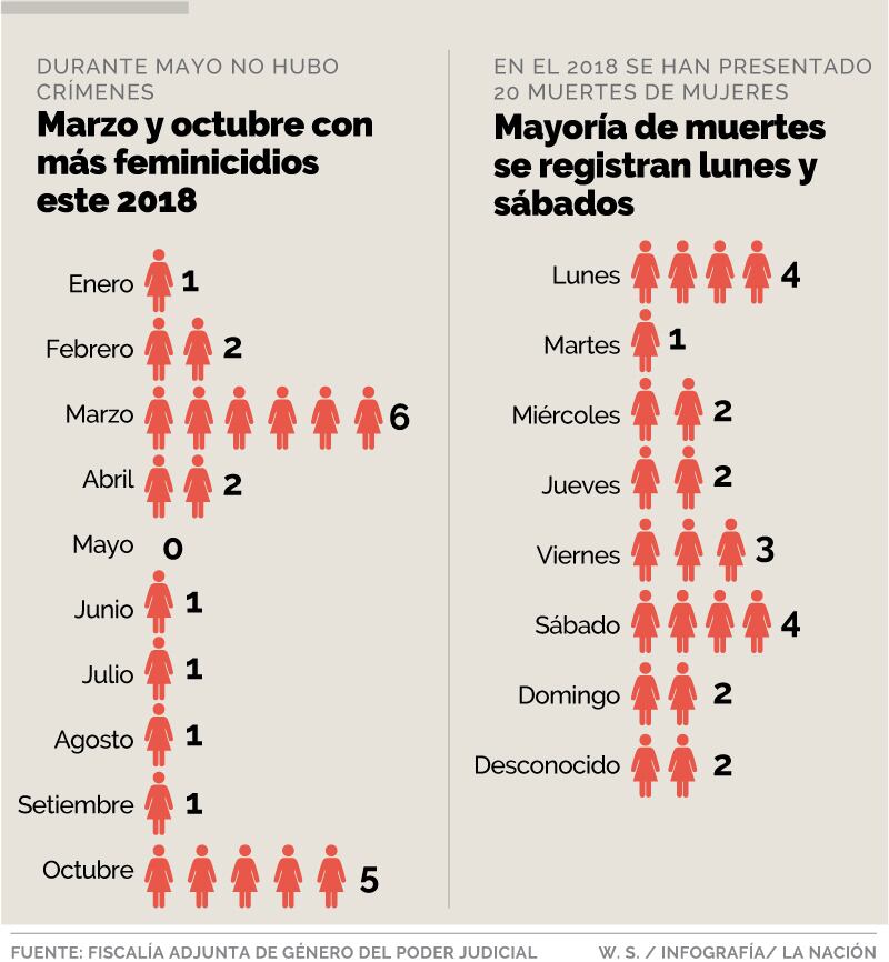 Hasta ahora, marzo es el mes en el que más mujeres fueron asesinadas, ya que en esos 31 días hubo seis muertes. Le sigue octubre con cinco; febrero y abril con dos cada uno; enero, junio, julio, agosto y setiembre con uno por cada mes; mientras que en mayo no se registraron casos de este tipo.