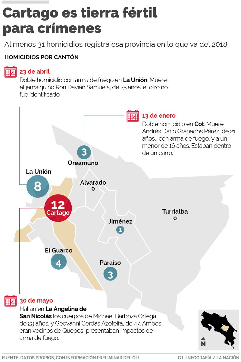 En lo que va de este año, la Policía Judicial ha registrado al menos 31 asesinatos en Cartago, mientras que en el mismo periodo del año pasado fueron 12. El incremento ronda el 158%.