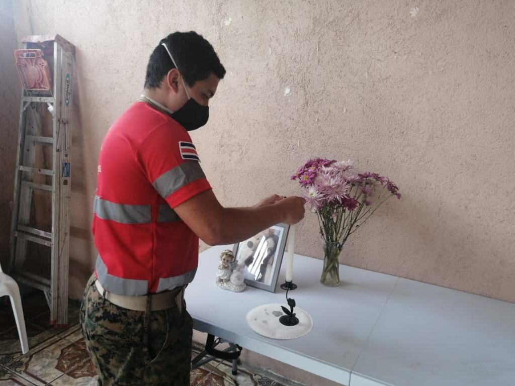 Una vela, un ramo de flores moradas con blanco y una fotografía acompañaron a los rescatistas del Cuerpo Voluntario de Emergencias de Pavas por 12 días en un salón comunal de Paraíso, Cartago.