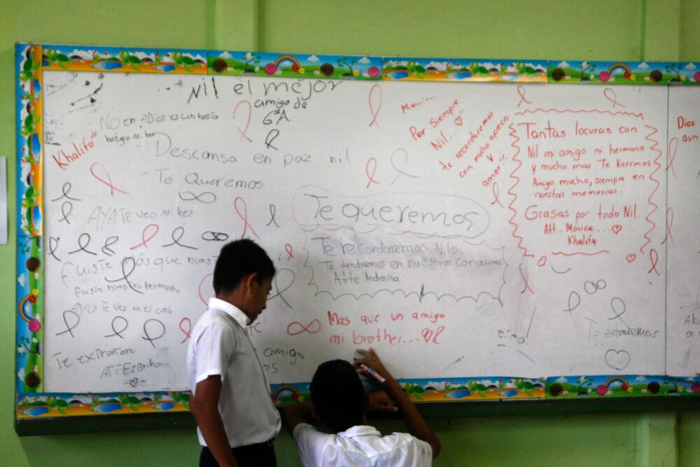 “No a la violencia y no a las drogas”, escribió una de las niñas en una de los 28 compañeros del sexto grado del centro educativo. Todos ellos se colocaron un pequeño lazo negro.
