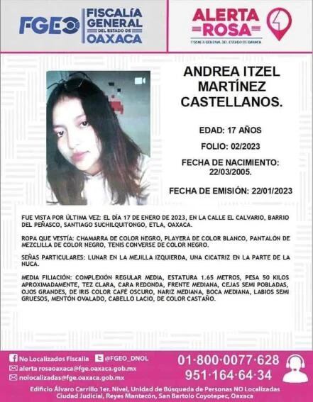 Según la información oficial, un día después de la desaparición, el 18 de enero, la fiscalía local en la Villa de Etla inició la carpeta de investigación 2085/FVCE/ETLA/2023, por la desaparición de la adolescente, quien fue vista por última ocasión en la población de Santiago Suchilquitongo, comunidad de los Valles Centrales de Oaxaca.
