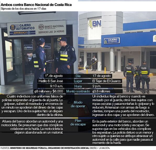 En el otro asalto, ocurrido el 1.° de agosto en Hatillo 6, cuatro individuos con uniformes falsos de policías requirieron solo un minuto para asaltar la oficina del Banco Nacional de Costa Rica.