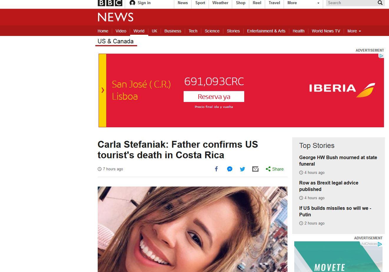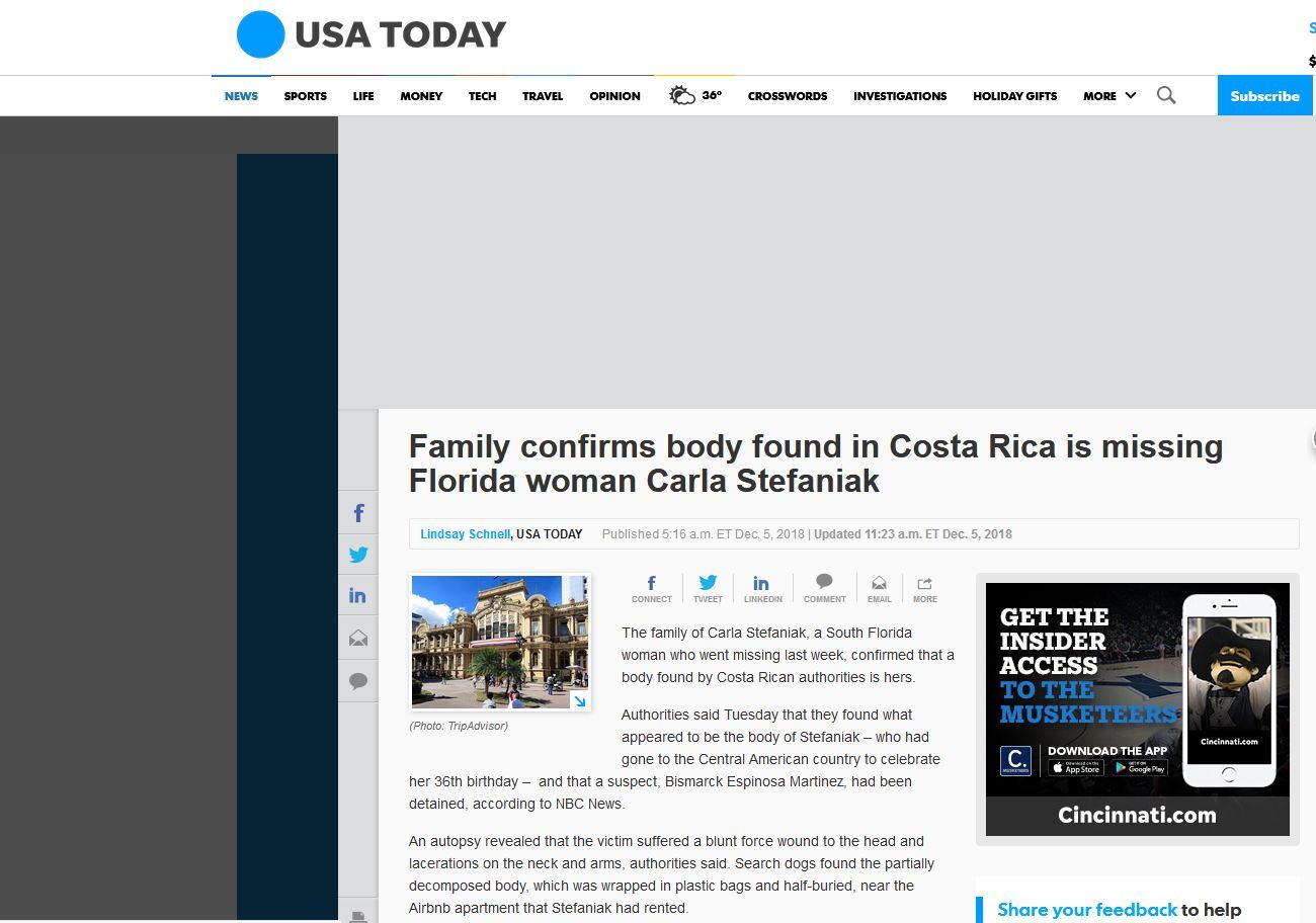 Diferentes periódicos reportaron en sus ediciones en línea el crimen de la turista venezolano - estadounidense Carla Stefaniak, cuyo cuerpo apareció en la misma propiedad donde opera un hotel, en San Antonio de Escazú.