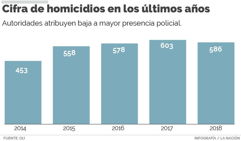 Desde el 2012 ese dato registraba una tendencia a la alza, por lo que es la primera vez en seis años que se da una disminución. De igual forma, la tasa de muertes violentas por cada 100.000 habitantes pasó de 12 en el 2017 a 11,72 en el 2018.