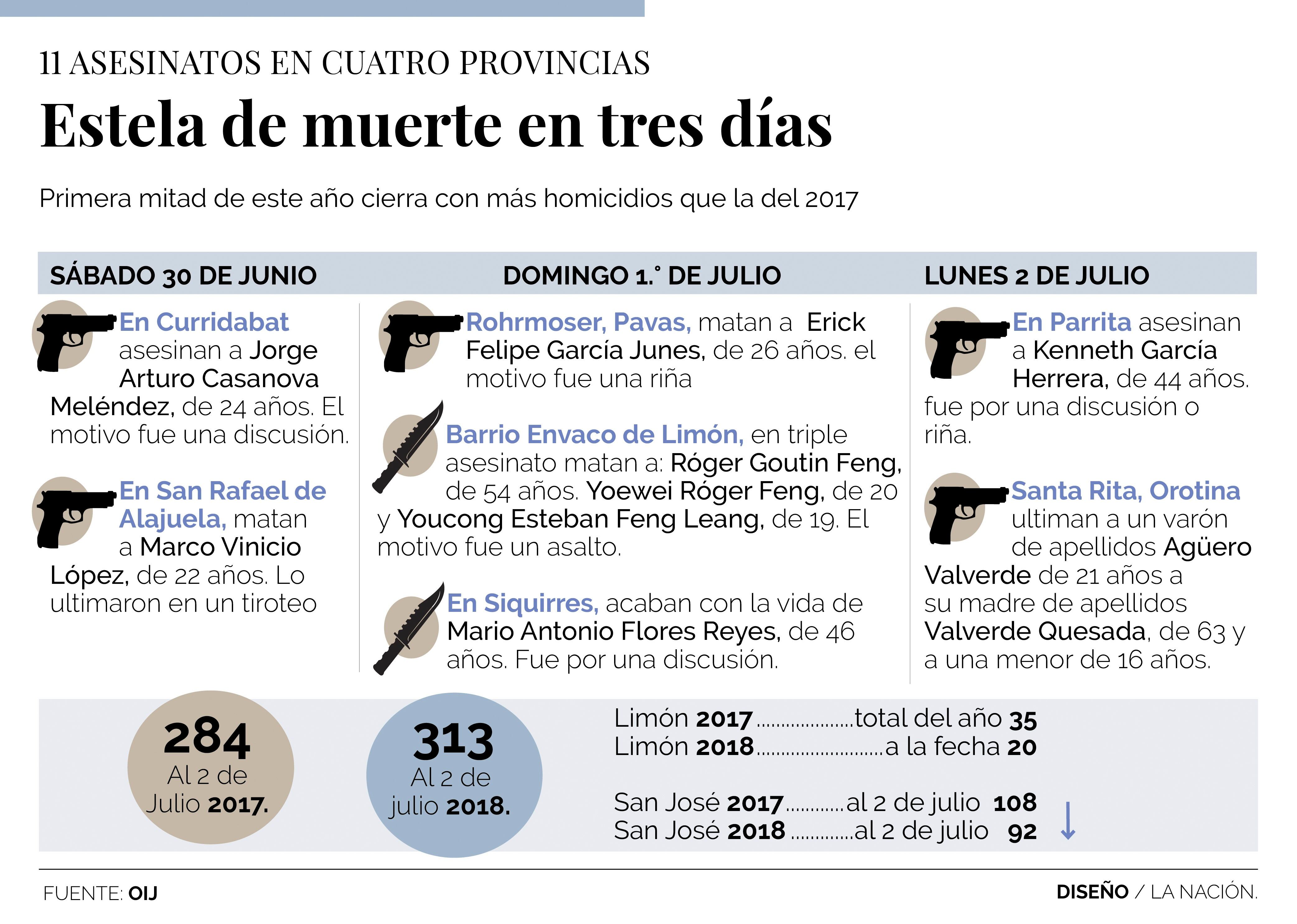 En apenas tres días, el Organismo de Investigación Judicial OIJ atendió once asesinatos generados por asaltos, riñas y tiroteos en cuatro provincias.