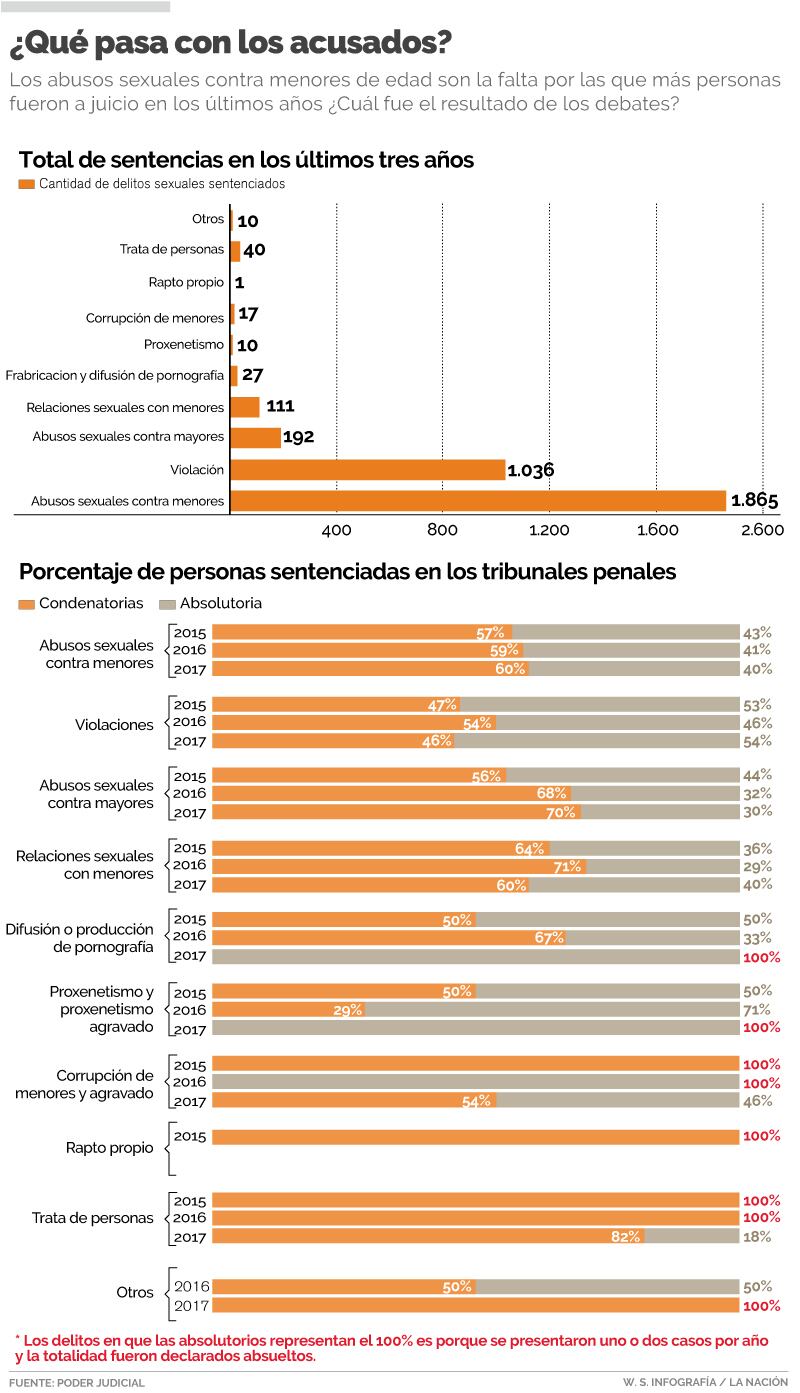 Según estadísticas del Poder Judicial, entre 2015 y 2017 los tribunales juzgaron a 3.310 personas por violaciones, abusos sexuales, tentativa de abuso sexual, proxenetismo, fabricación y divulgación de pornografía, rapto con fines de matrimonio y seducción de menores de edad por medios electrónicos, principalmente.