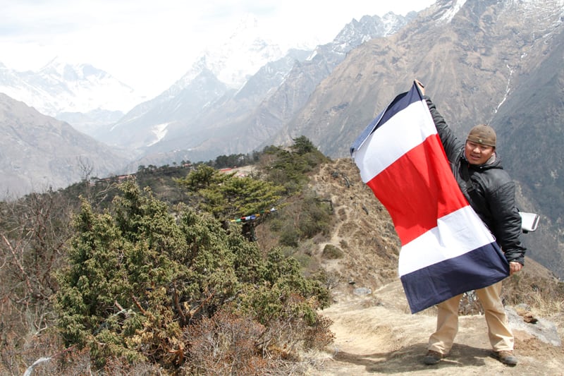 En su camino de vuelta, Rodrigo notó unas banderas de blanco, azul y rojo pegadas en los maletines de un grupo: siete hombres y tres mujeres costarricenses que se dirigían al campo base del Everest, donde estaba Asha con Marzec; llegar allí les tomaría dos días.