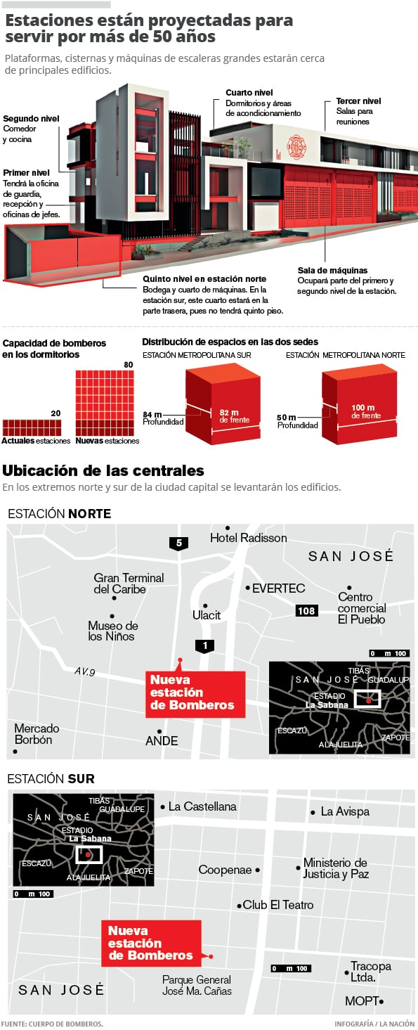 El Cuerpo de Bomberos levantará antes del 2018 dos estaciones grandes al norte y al sur de la capital, valoradas en $25 millones (unos ¢13.000 millones) para una mejor atención de emergencias cerca de los principales edificios del país.