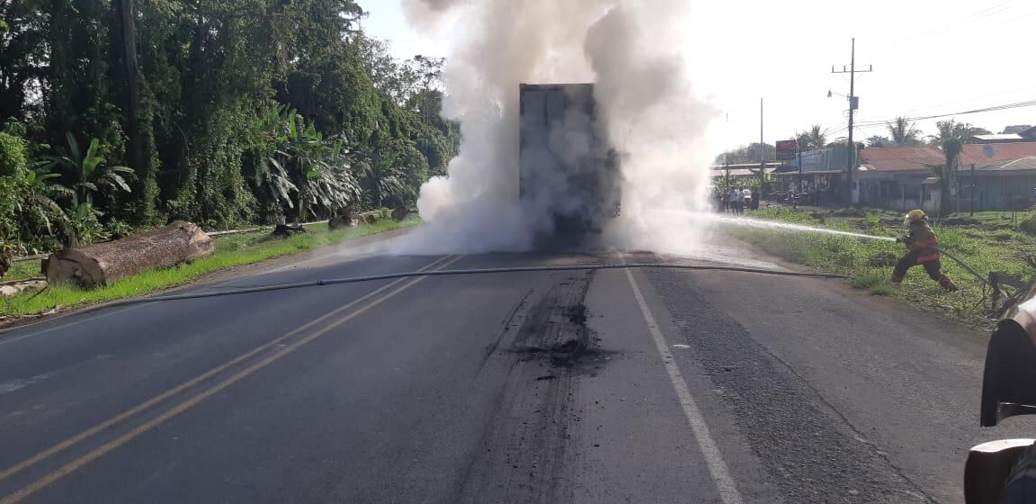 El incidente de este sábado se generó a las 8:22 a. m., cuando un tráiler circulaba frente al súper Venecia en Carrandí. Hubo que enviar una máquina extintora que en dos minutos controló la situación y se pudo salvar la mayor parte del camión.