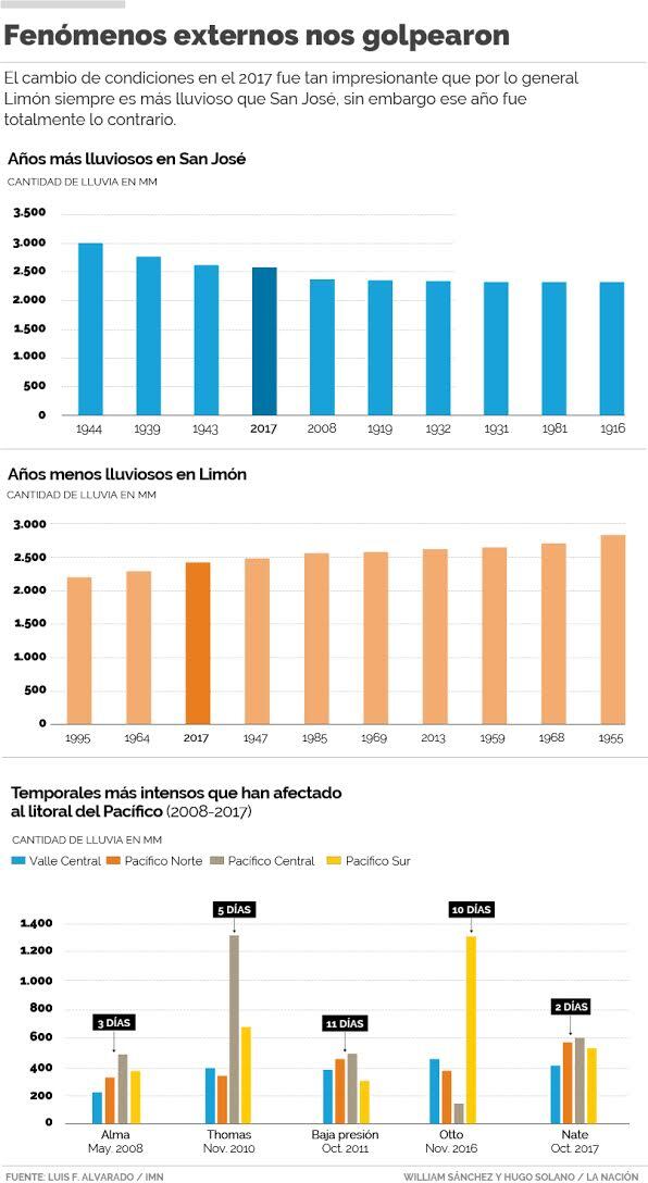 Desde el año 1900, cuando el Instituto Meteorológico Nacional (IMN) comenzó a guardar registros de lluvia en San José, hasta la actualidad, el 2017 se ubicó como el cuarto año más lluvioso en la capital, ya que cayeron 2.550 litros de agua por metro cuadrado, mientras que el promedio es de 1.780 litros.