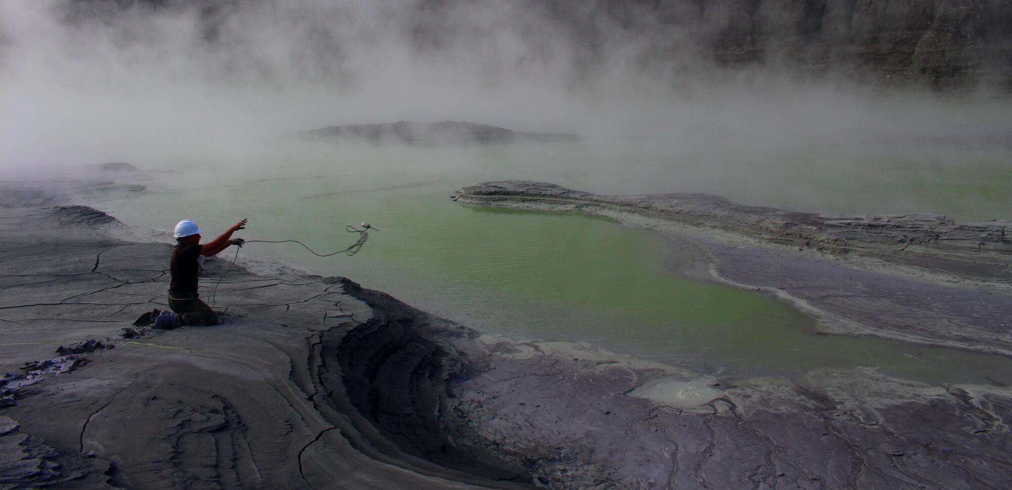 Los vulcanólogos tuvieron que lanzar una botella desde unos cinco metros de distancia para recoger agua y determinar en el laboratorio el contenido de cloro, azufre, y demás componentes que permiten conocer lo que acontece a lo interno del lago.