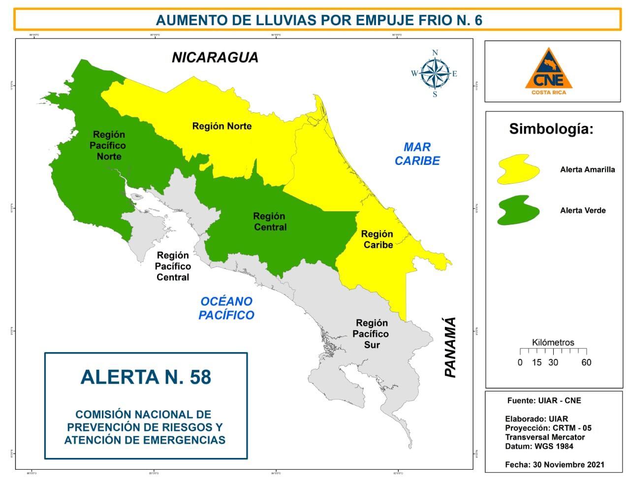 La Comisión Nacional de Emergencia (CNE) declaró alerta amarilla para todo el litoral Caribe, así como para la zona norte (San Carlos, Sarapiquí, Upala, Guatuso y Los Chiles). También se estableció alerta verde para el Valle Central y el Pacífico norte, por lo que más de la mitad del territorio quedó cubierto por medidas preventivas que implican movilización y monitoreo por parte de los comités municipales de emergencias.