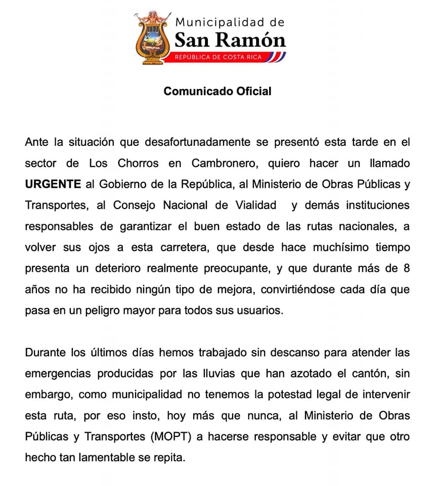 “Como municipalidad, no tenemos potestad legal de intervenir en esta ruta, por eso instamos, hoy más que nunca, al MOPT a hacerse responsable y evitar que otro hecho tan lamentable se repita”, concluyó el texto.