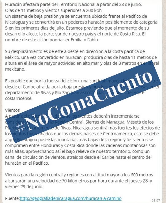 Un mensaje falso difundido vía WhatsApp informa sobre un supuesto huracán que impactaría a Costa Rica este 28 de junio.