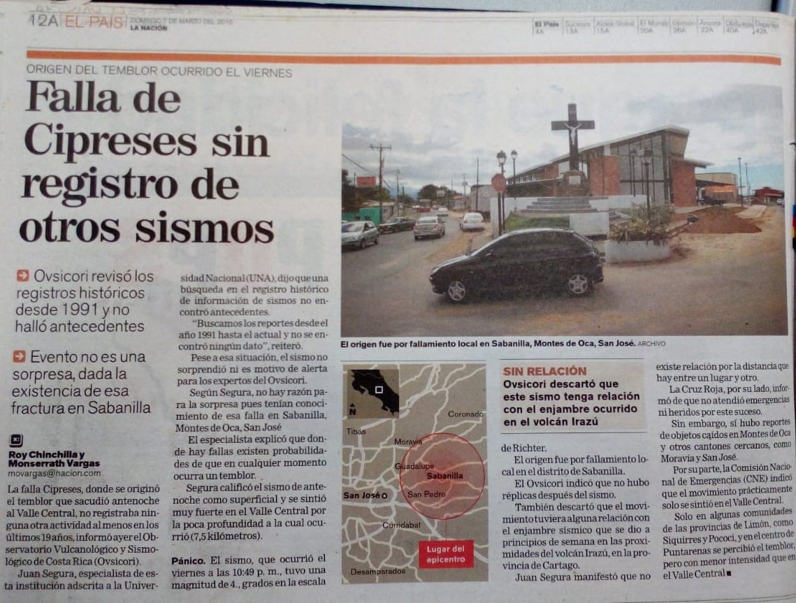 “Está en la mancha urbana y ahí los fallamientos son poco frecuentes, por eso nos interesa tanto su estudio, para ver las fallas más cerca de la ciudad. El temblor del 2010 generó caída de objetos livianos”, dijo Lepolt Linkimer, sismólogo de la Red.