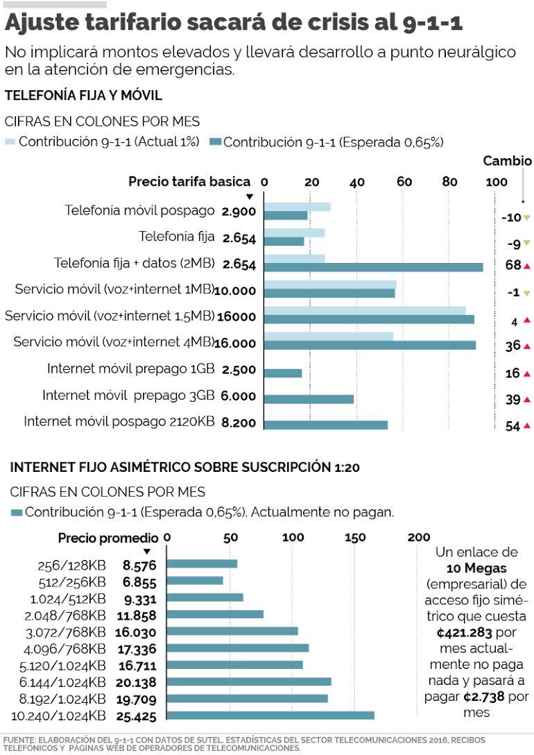 La variación por este cambio es relativamente baja, por ejemplo, si usted tiene un paquete de servicios móviles con voz e Internet de 1,5 megas, actualmente contribuye con ¢87 por mes y pasará a pagar ¢91; mientras que en un paquete de voz e Internet de 4 megas, el cobro variará de ¢56 a ¢91, es decir una diferencia de ¢35.