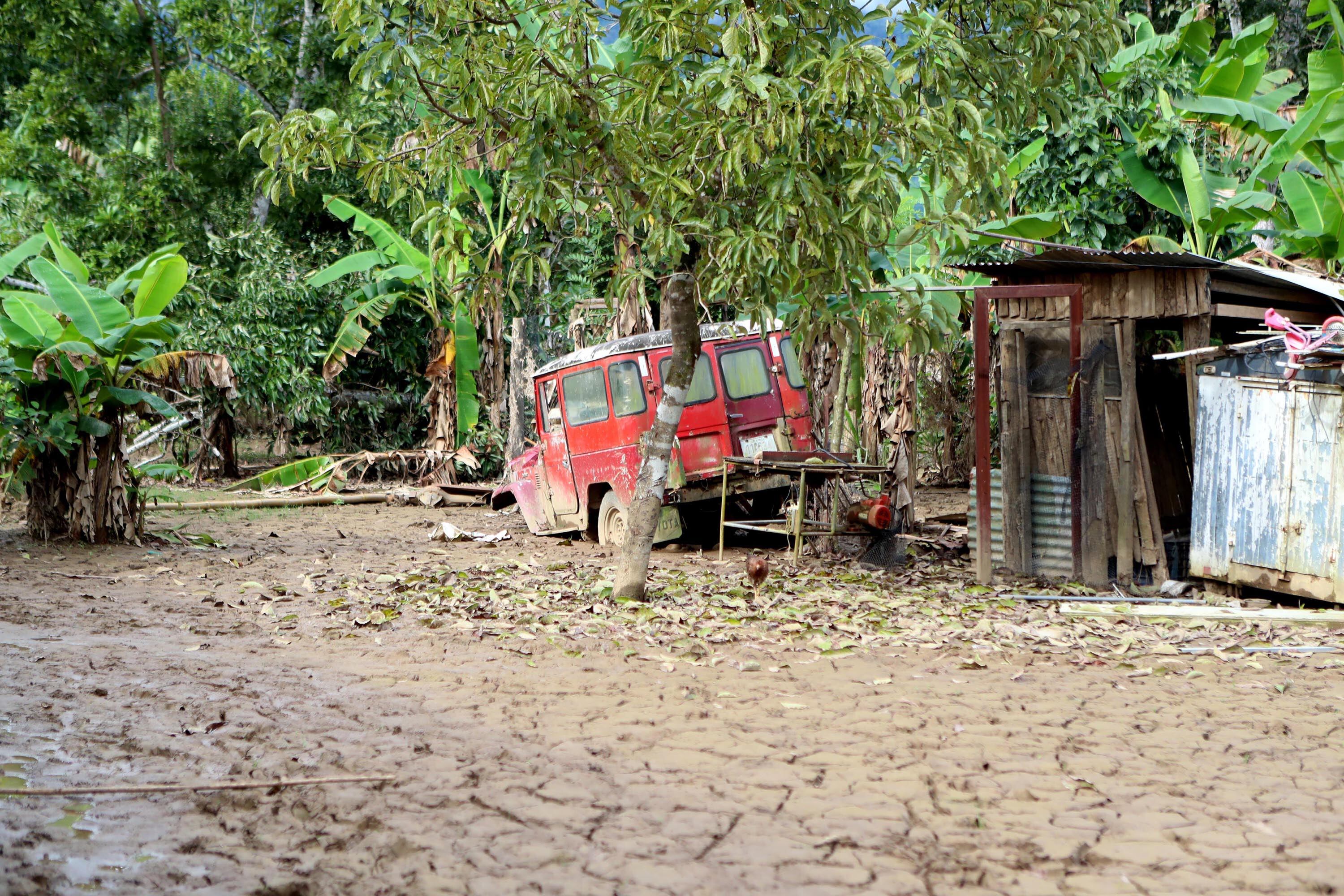 Todavía se ven muchas tucas tiradas en la finca, así como muebles apilados que el agua echó a perder, aunque ya lograron habilitar el camino de acceso al plantío de plátanos que usan como materia prima de su empresa.