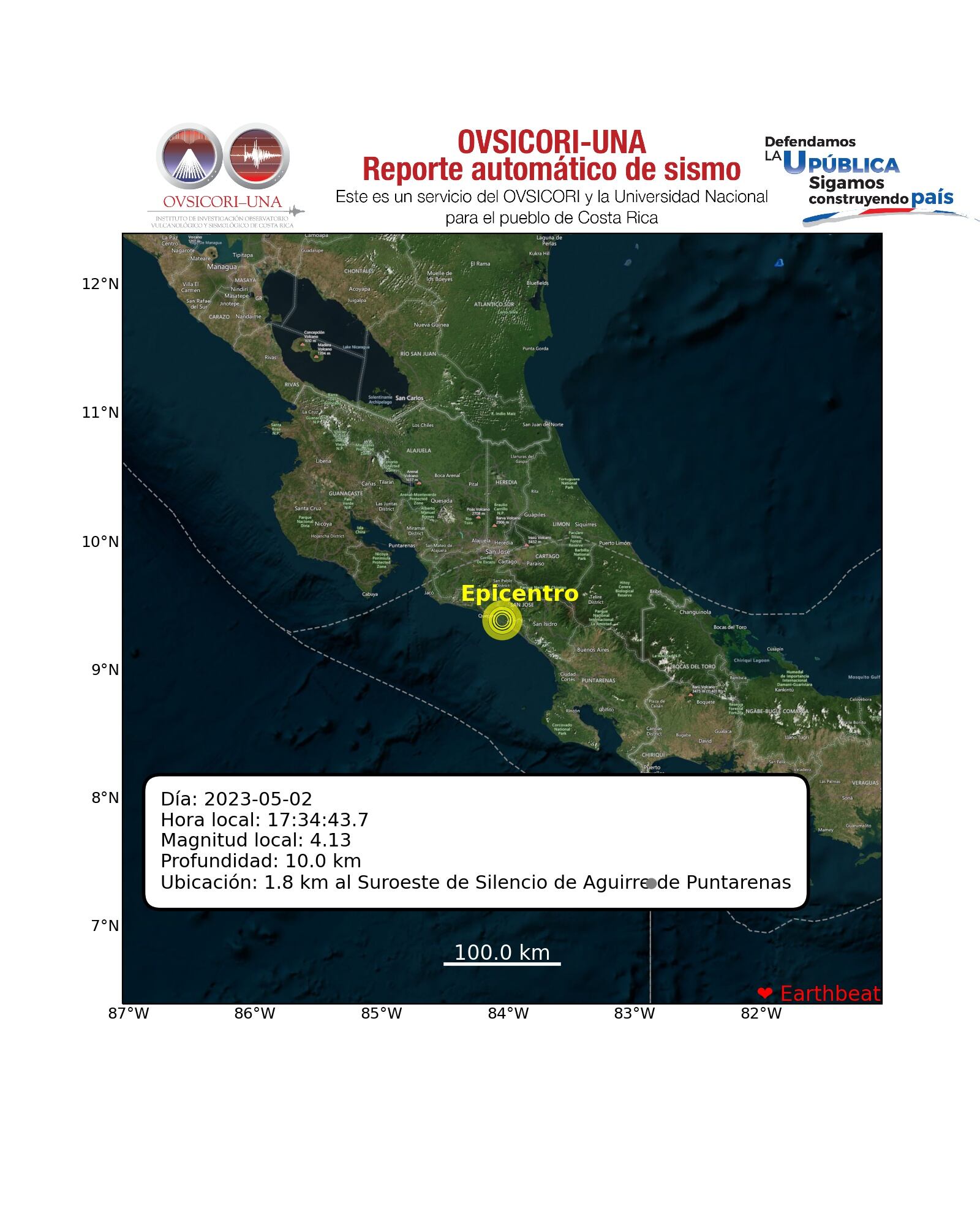 Por su parte, la Red Sismológica Nacional (RSN) lo registró con una magnitud de 3,8 a 16 km al norte de Savegre, Quepos, a una profundidad de 56 km.