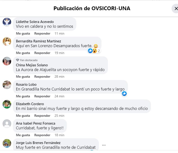 Vecinos de San José, Pavas, Curridabat, Cartago, Desamparados, Alajuelita entre otras comunidades, reportaron en redes sociales de Ovsicori sentir el sismo como fuerte, rápido, ligero y de un solo golpe.