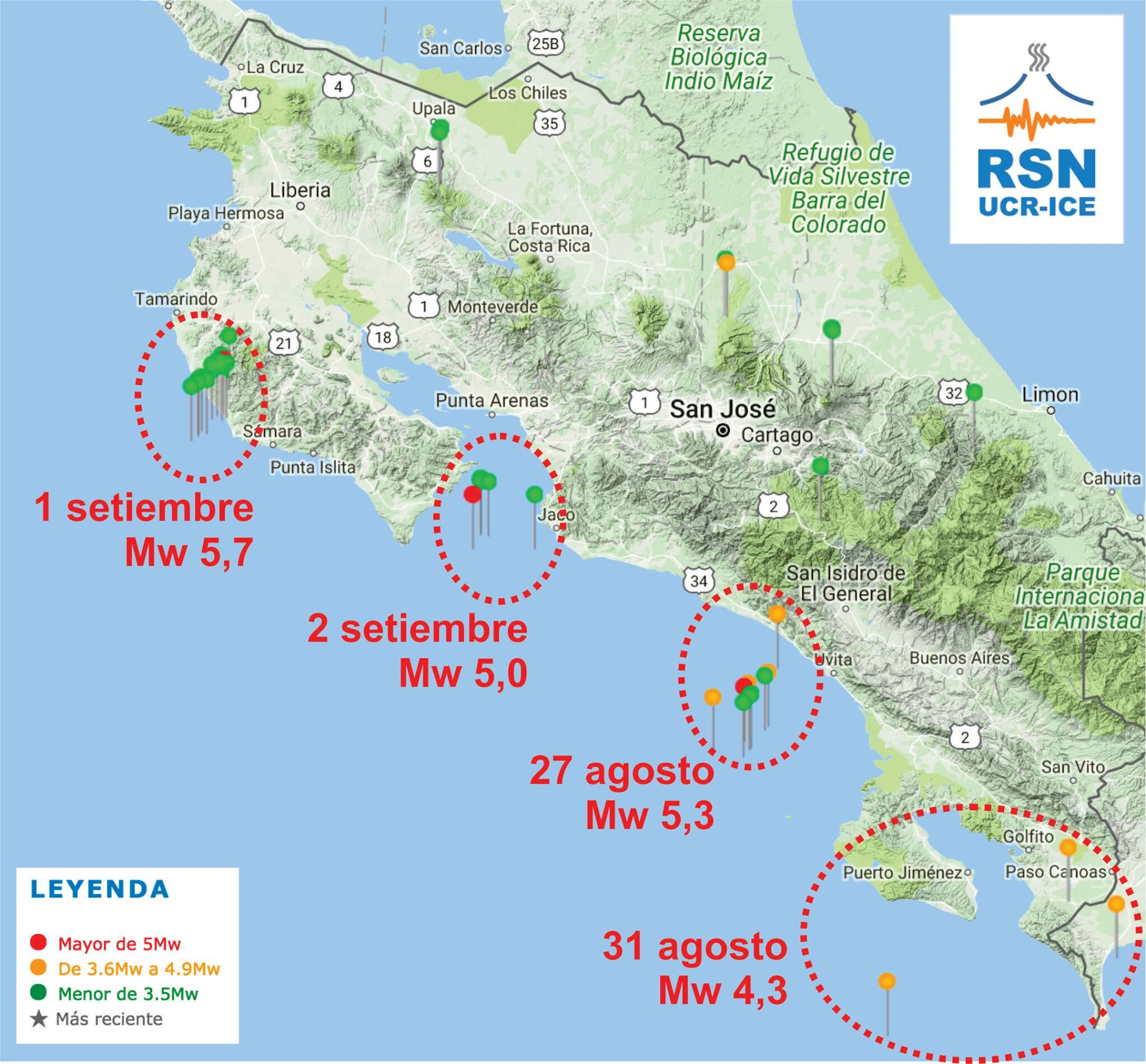 Ocurrieron en las madrugadas del domingo 27 de agosto (Mw 5,3), viernes 1 de setiembre (Mw 5,7) y este sábado (Mw 5,0). El origen de esa sismicidad es la subducción de la placa del Coco por debajo de la Caribe, esta última es la que sostiene el territorio continental costarricense.