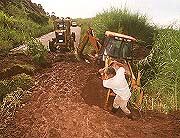 Los trabajadores tuvieron que emplearse a fondo para remover un cargador municipal, que el viernes quedó atrapado por el terraplén. El vehículo era conducido en ese momento por el operador Edgar Brenes, quien estuvo a punto de perecer sepultado.