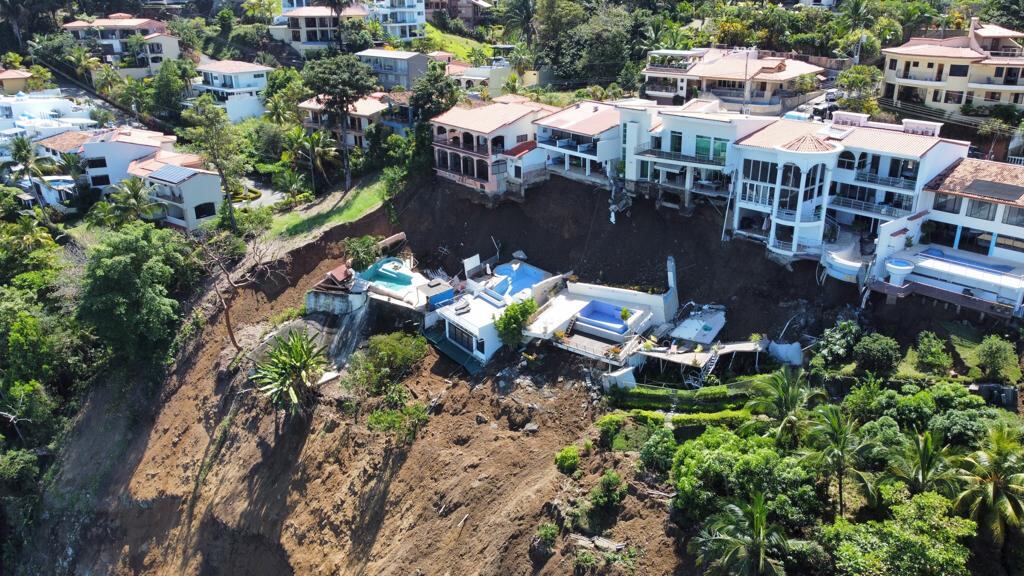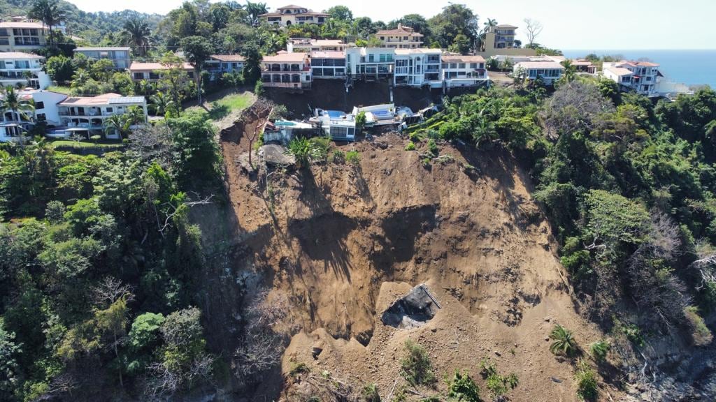 Al menos cinco viviendas cayeron a un precipicio en el residencial Altos de Leonamar, ubicado en Punta Leona, Garabito, y pese a la gravedad de la situación, ninguna persona habría resultado lesionada. De hecho, la Cruz Roja local dice que no recibió reporte de ese deslizamiento.