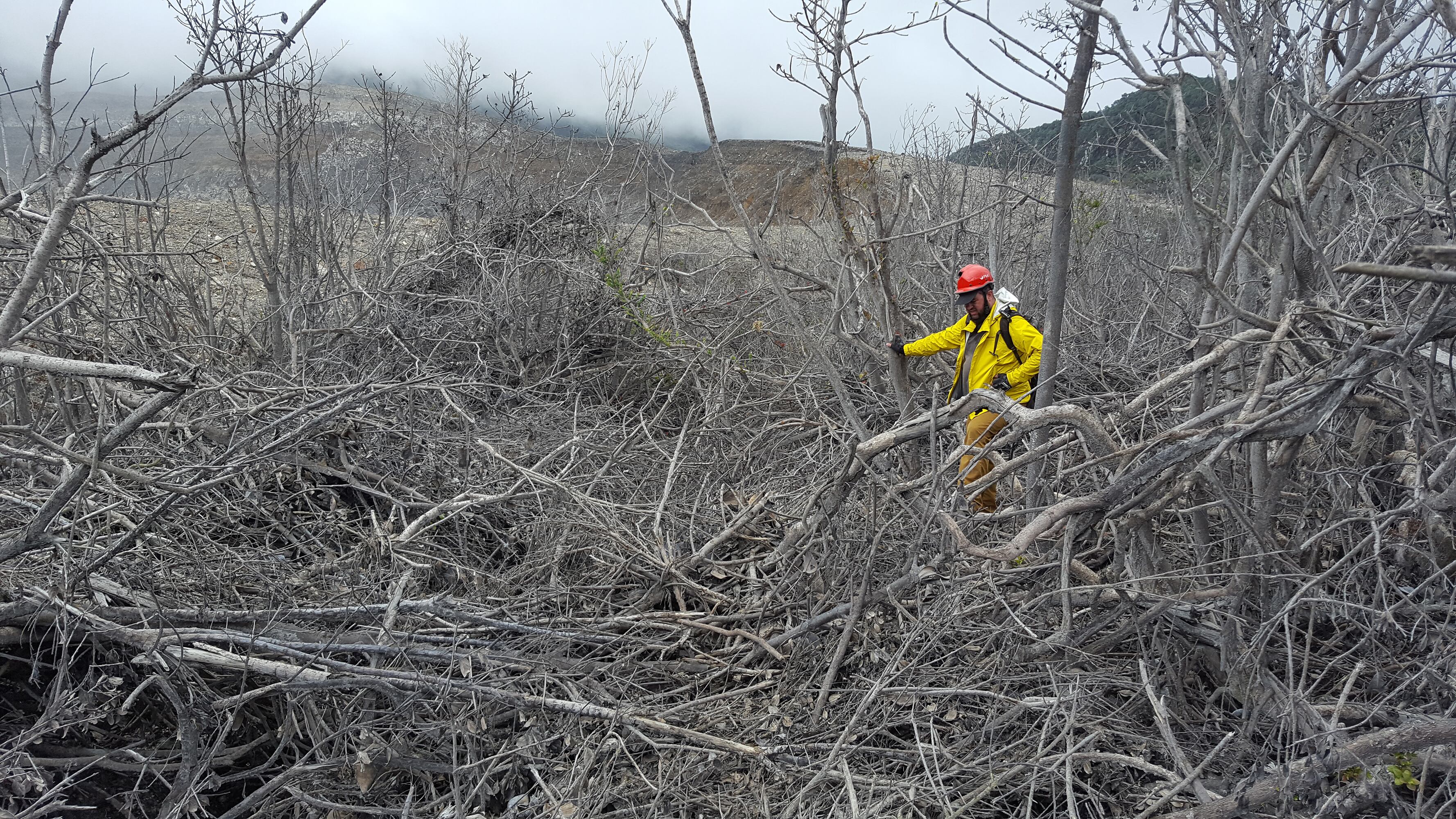 "Hay evidencia de los flujos piroclásticos (son gases calientes con material sólido que viajan a nivel de suelo). Ahí la vegetación se quemó por completo. Las ramas y los árboles quebrados por las rocas que pasaron como esquirlas o cuchillos y otras aplastadas por la oleada que tuvo que ir muy rápido", describió el especialista.