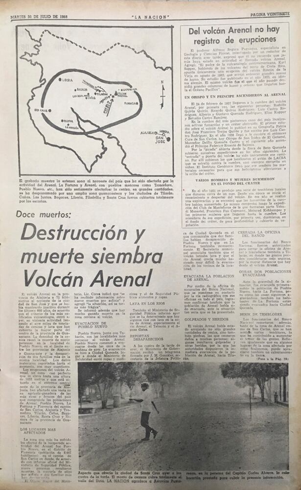 “El Arenal, que se ha mantenido inactivo desde tiempos inmemoriales, entró en violentísima actividad ayer, expulsando cenizas y lava que cubren una extensa zona de la provincia de Guanacaste”, se leía en este diario el 30 de julio.