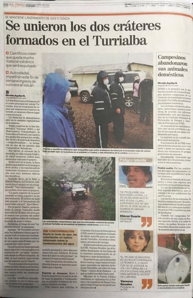 “La ceniza del volcán Turrialba podría seguir llegando a los cantones del noreste de San José y otros puntos del Valle Central por años. Así, sencilla y directa, fue la advertencia que hizo este viernes Gino González, geólogo de la Universidad de Costa Rica (UCR)”, publicó La Nación en mayo del año pasado. “El Turrialba puede generar erupciones por meses e inclusive años. Algo así ocurrió hace 150 años, cuando el volcán presentó actividad durante 17 años, recordó González”.