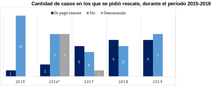 Respecto al 2019, de los 13 casos reportados en seis se pagó la exigencia o rescate monetario y en siete no. El informe no detalla, en muchas ocasiones, el monto de los desembolsos.
