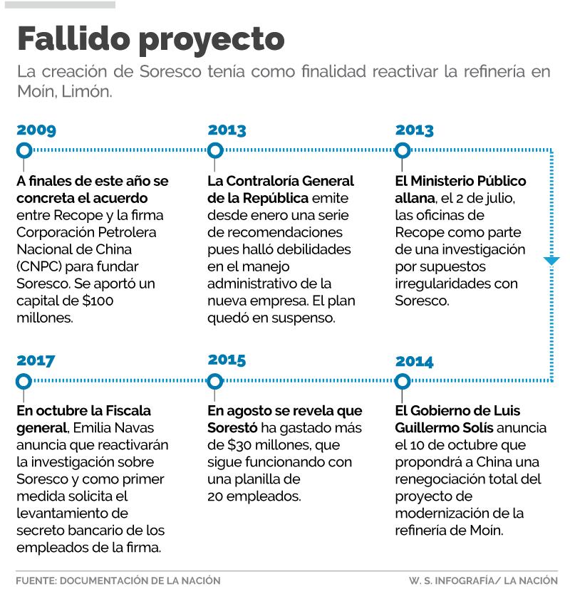 La empresa Soresco fue creada en 2009 con la idea de que construyera y operara una refinería en Moín. El plan quedó frenado en junio de 2013, cuando la Contraloría General de la República (CGR) advirtió de que el estudio de factibilidad había sido elaborara por una firma vinculada a la socia china.