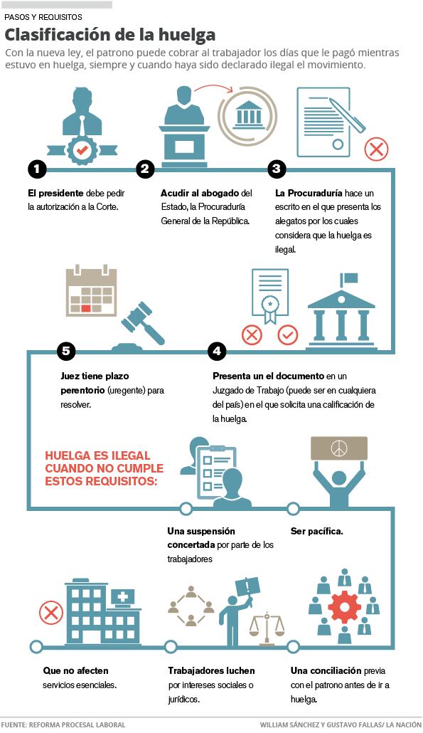 La nueva ley dice que una huelga es legal cuando cumple con todos estos requisitos: que exista una suspensión concertada por parte de los trabajadores, ser pacífica, que hubiese una conciliación previa con el patrono antes de ir a huelga, que los trabajadores luchen por intereses sociales o jurídicos y que no afecten servicios esenciales.