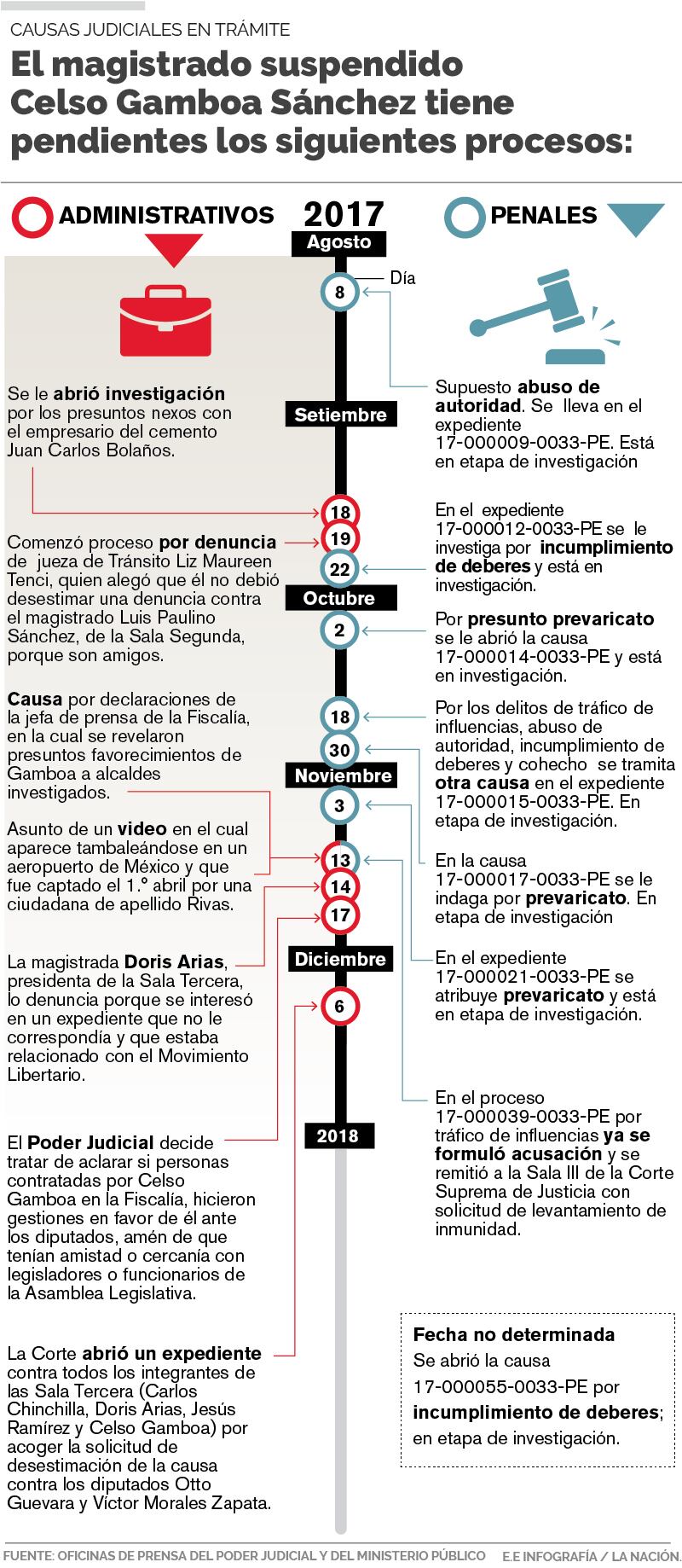 Gamboa se encuentra suspendido de su cargo por un lapso de tres meses, que vence el 15 de abril. En su contra figuran otros siete procesos disciplinarios abiertos en la Inspección Judicial, uno motivado por su aparente relación con el empresario del cemento Juan Carlos Bolaños.