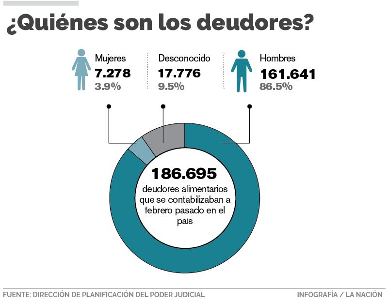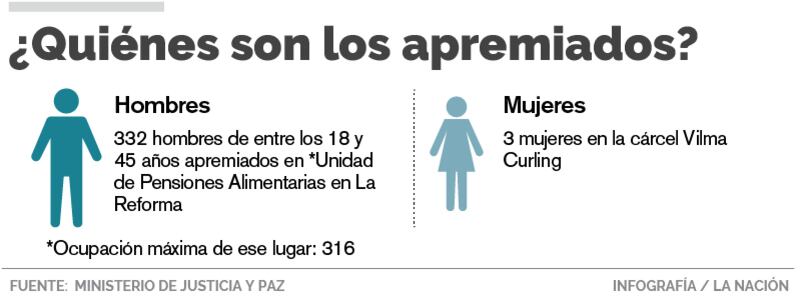 En la Unidad de Pensiones Alimentarias, en la cárcel La Reforma, hay 332 hombres que fueron arrestados por atrasarse con la cuota mensual. Mientras que en la cárcel Vilma Curling (exlusiva para mujeres) hay tres detenidas por lo mismo, según el Ministerio de Justicia y Paz.