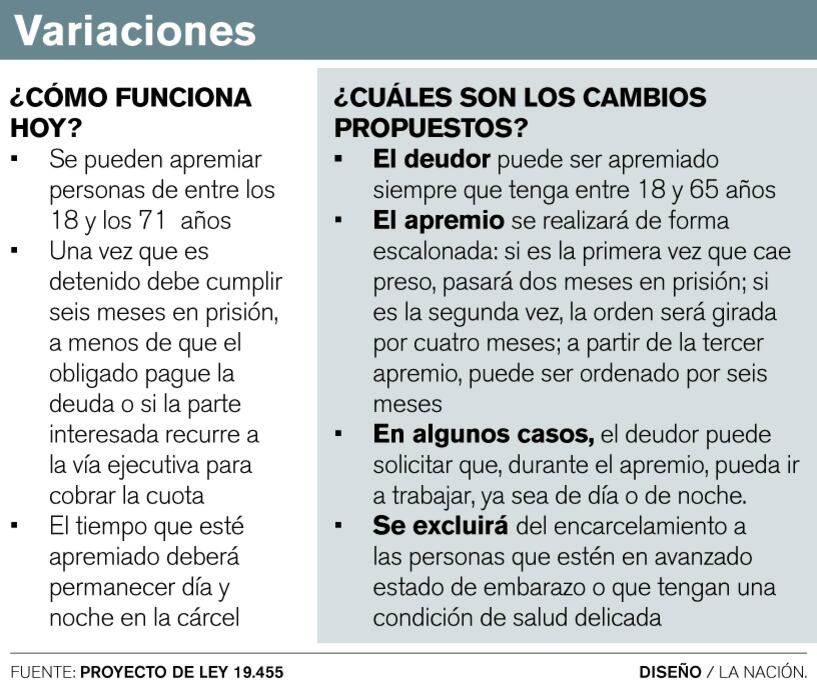 No obstante, en caso de que los diputados aprobaran en segundo debate el proyecto de ley 19.455 (Código Procesal de Familia), esos apremiados podrían pedir un permiso especial al juez que les permita salir de la cárcel para buscar trabajo. Ese sería uno de los cuatro cambios más importantes que se aplicaría a la Ley de Pensiones Alimentarias,