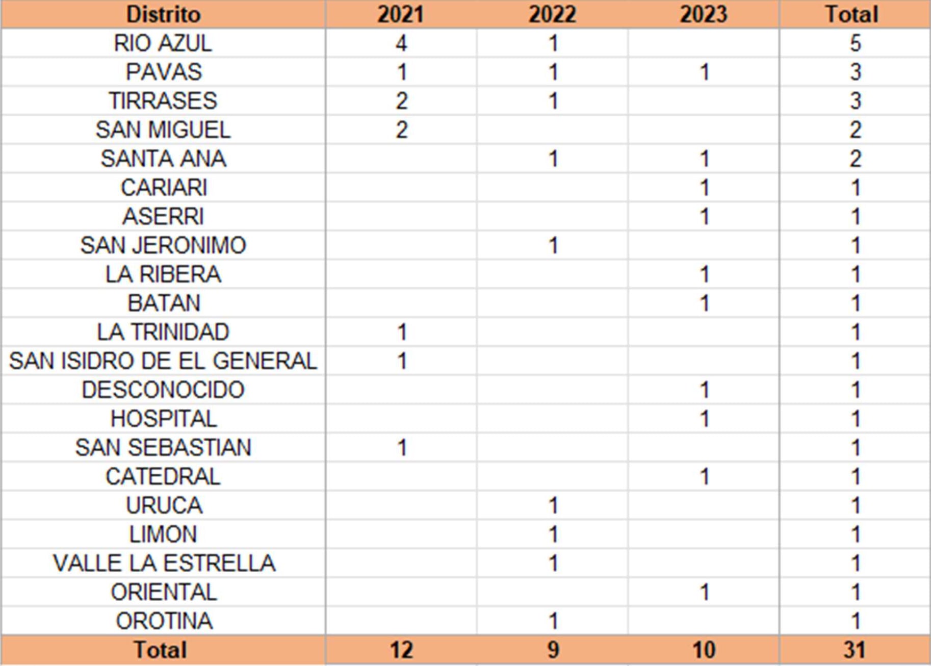 En el 2021 hubo 12 casos, el año pasado 9 y en solo los primeros cuatro meses del 2023 se registraron 10 denuncias, lo que evidencia el crecimiento en este tipo de delito, ya que el año podría cerrar con una cifra mayor a los anteriores. Enero y agosto son los meses con más denuncias, las cuales ocurren principalmente en San José y Cartago. Los distritos de Río Azul de La Unión, Tirrases de Curridabat y Pavas de San José son los que concentran, hasta el momento, la mayoría de casos.