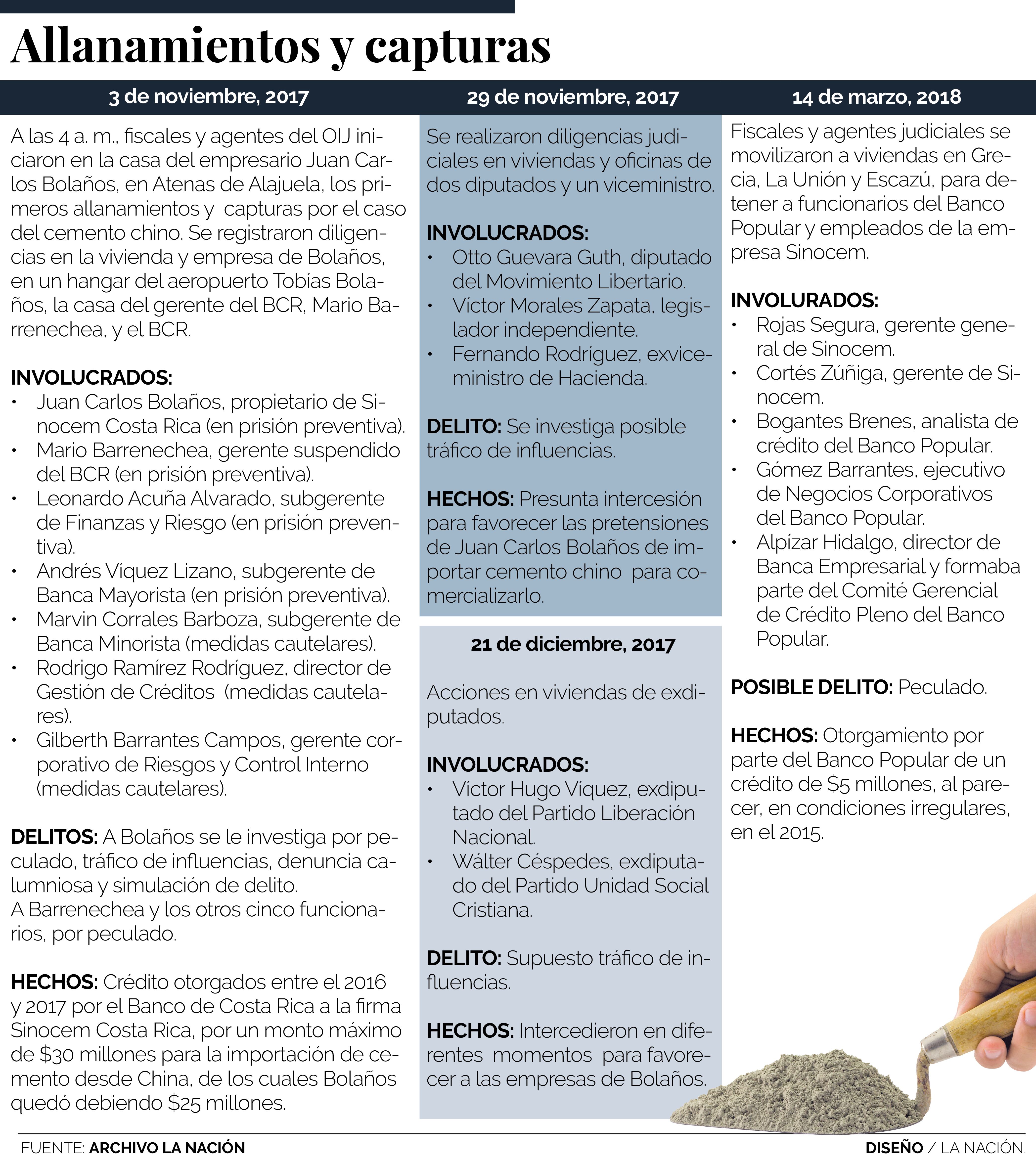 Aparte de esas personas, el Ministerio Público también ordenó la captura este miércoles de Javier Rojas Segura, gerente general de Sinocem Costa Rica y otro empleado de esa compañía de apellidos Cortés Zúñiga. Sinocem, propiedad de Bolaños, fue constituida para la importación y comercialización del cemento traído de China.